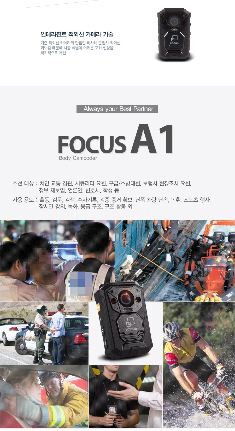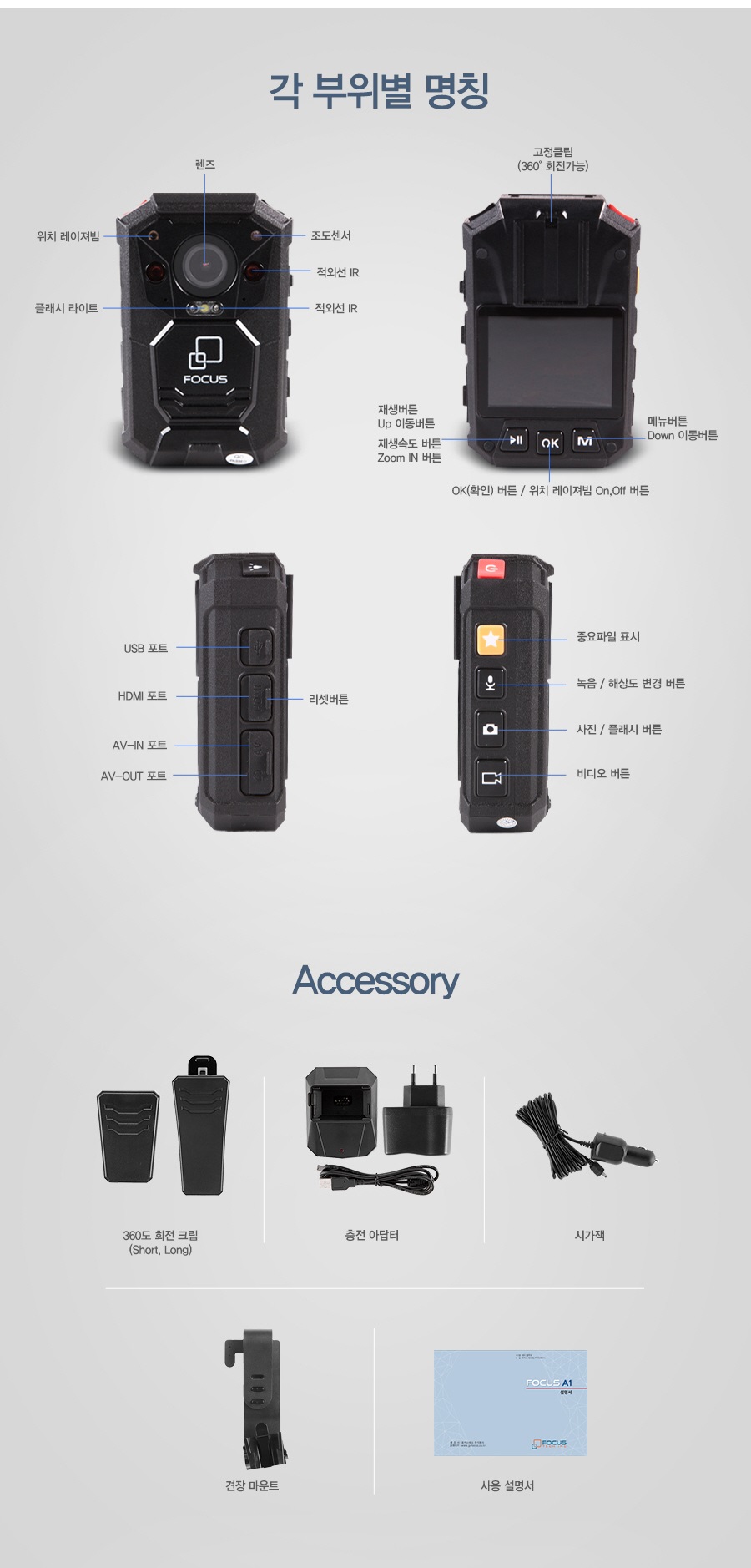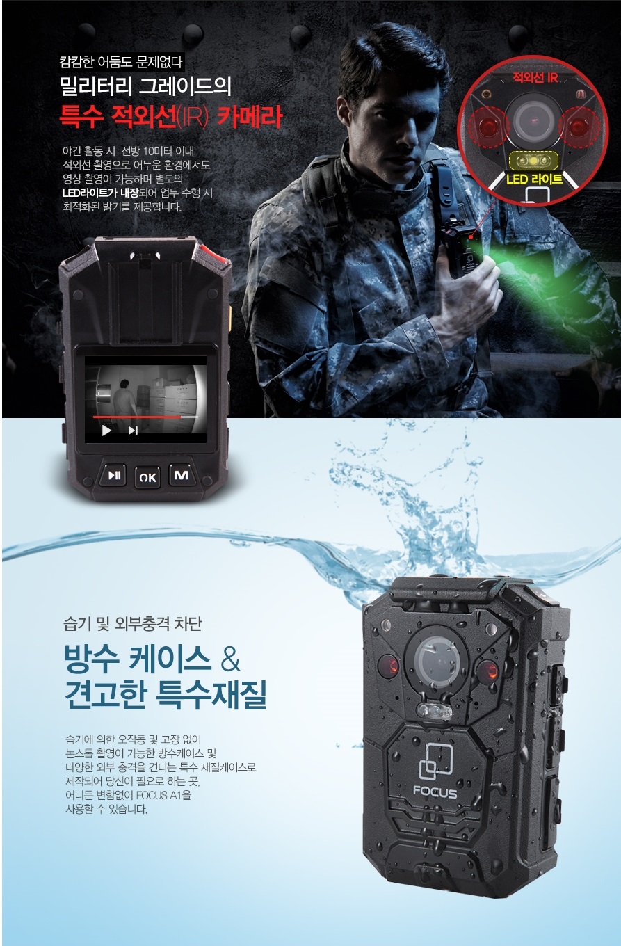 포커스A1 액션캠 바디캠 스포츠카메라 자전거 바이크 야간적외선 11시간연속촬영 보조캠포함