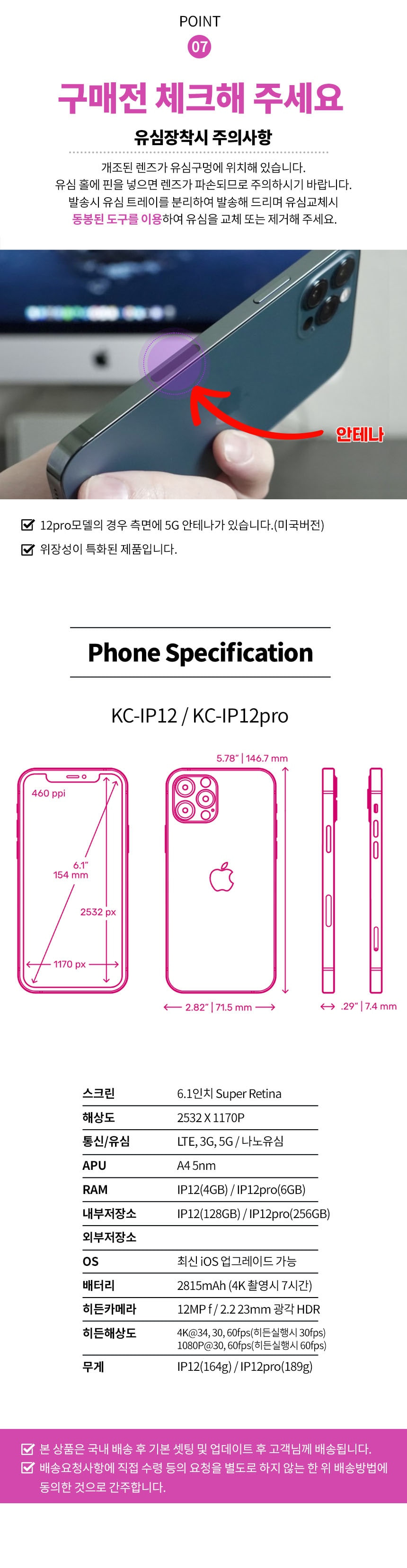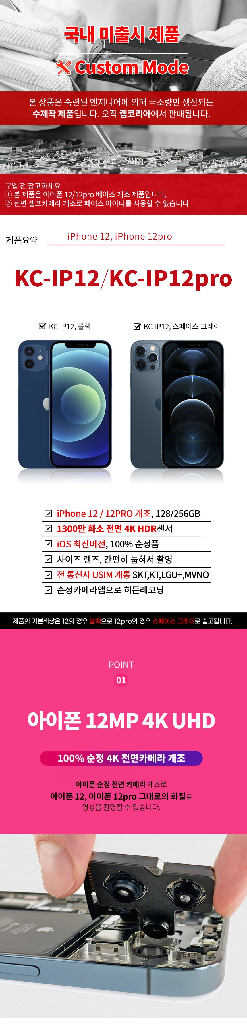 아이폰12 PRO 특수개조형 1300만화소 측가로형 렌즈 상단 추가탑제 4k 듀얼렌즈 256GB 히든캠 카메라