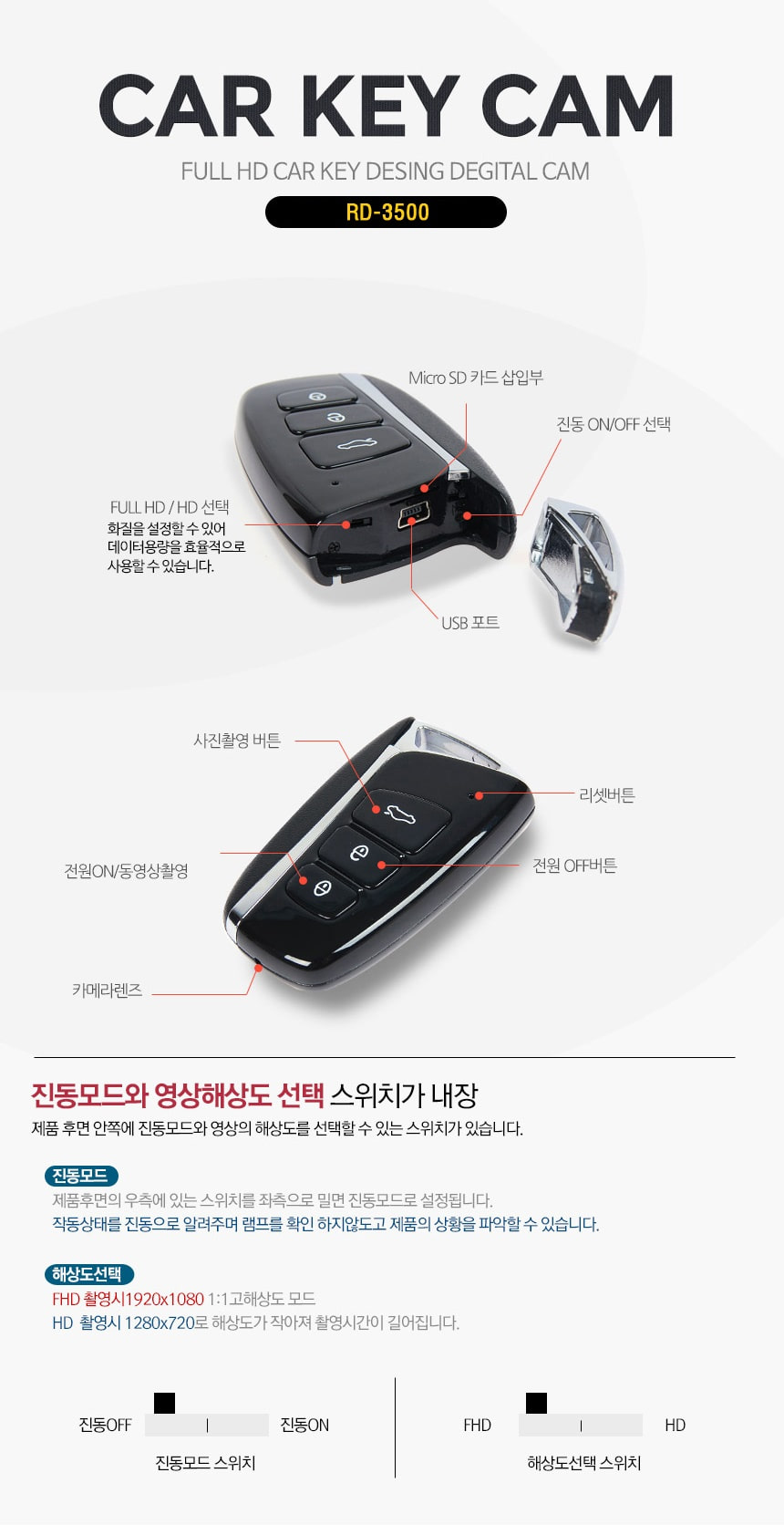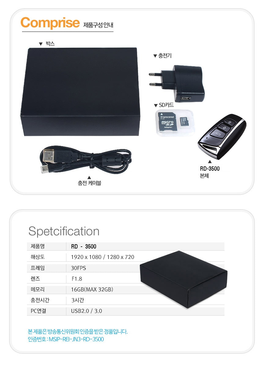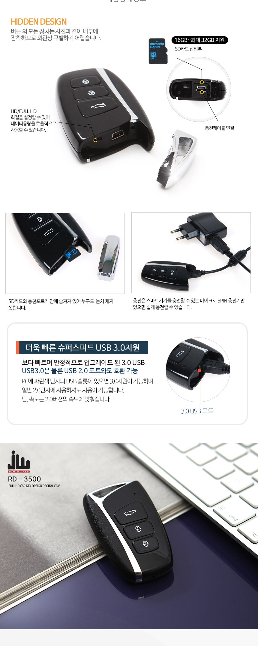 RD3500 자동차키 캠코더 차키카메라 고화질 FULL HD 최대 30프레임 70분 연속 촬영 32GB