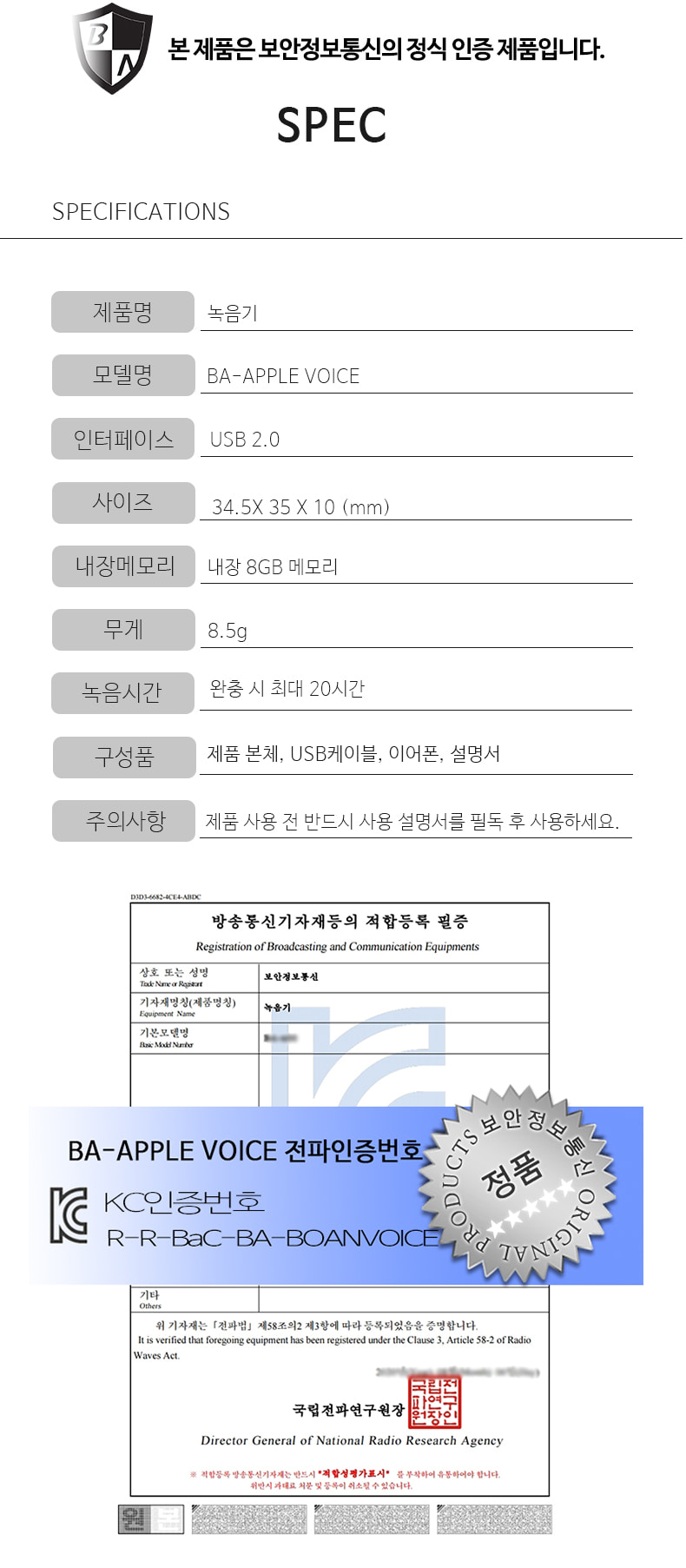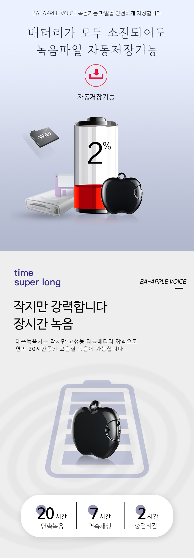 미니녹음기 BA-MINI20 20시간 연속녹음 8GB USB타입