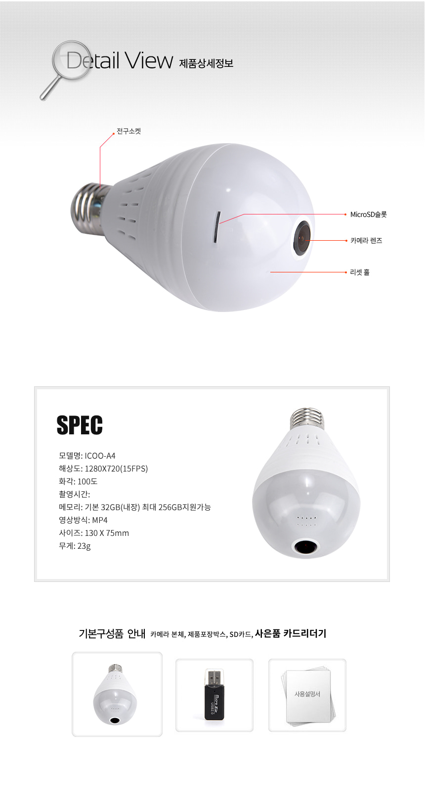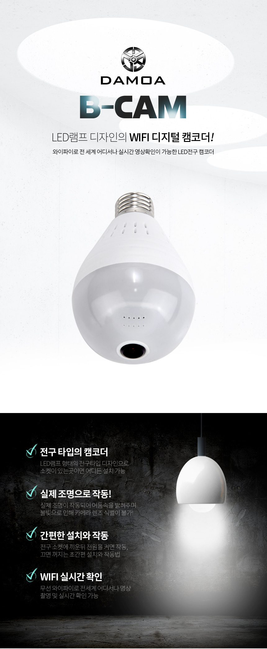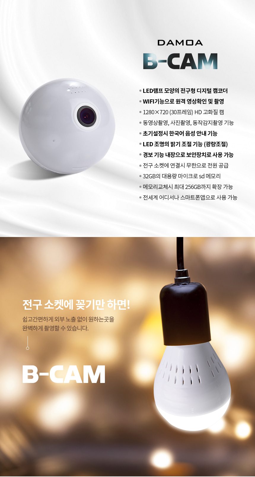 B-CAM LED램프형 WIFI 원격감시 전세계 어디서든 실시간영상 확인가능 256GB 지원