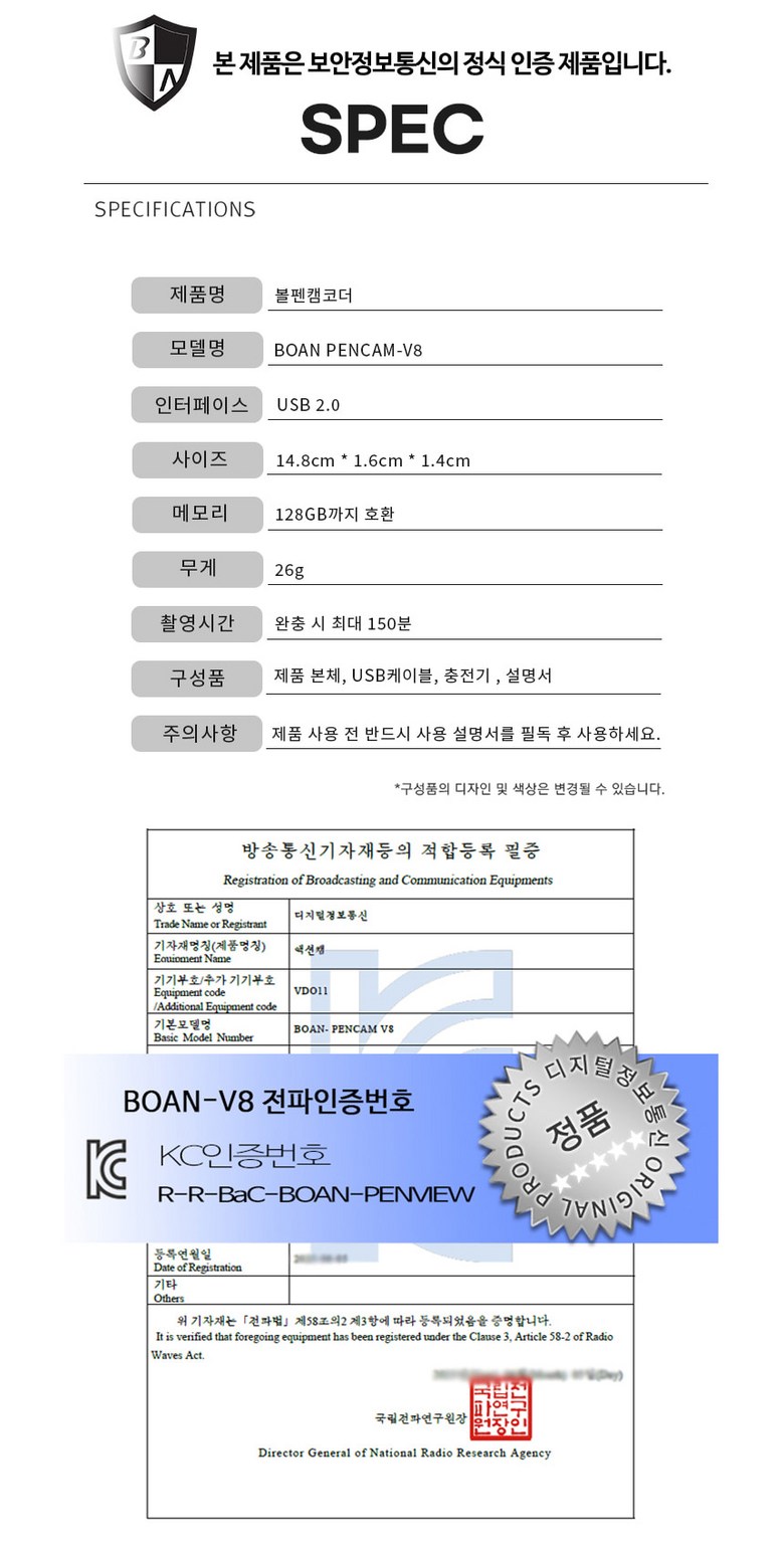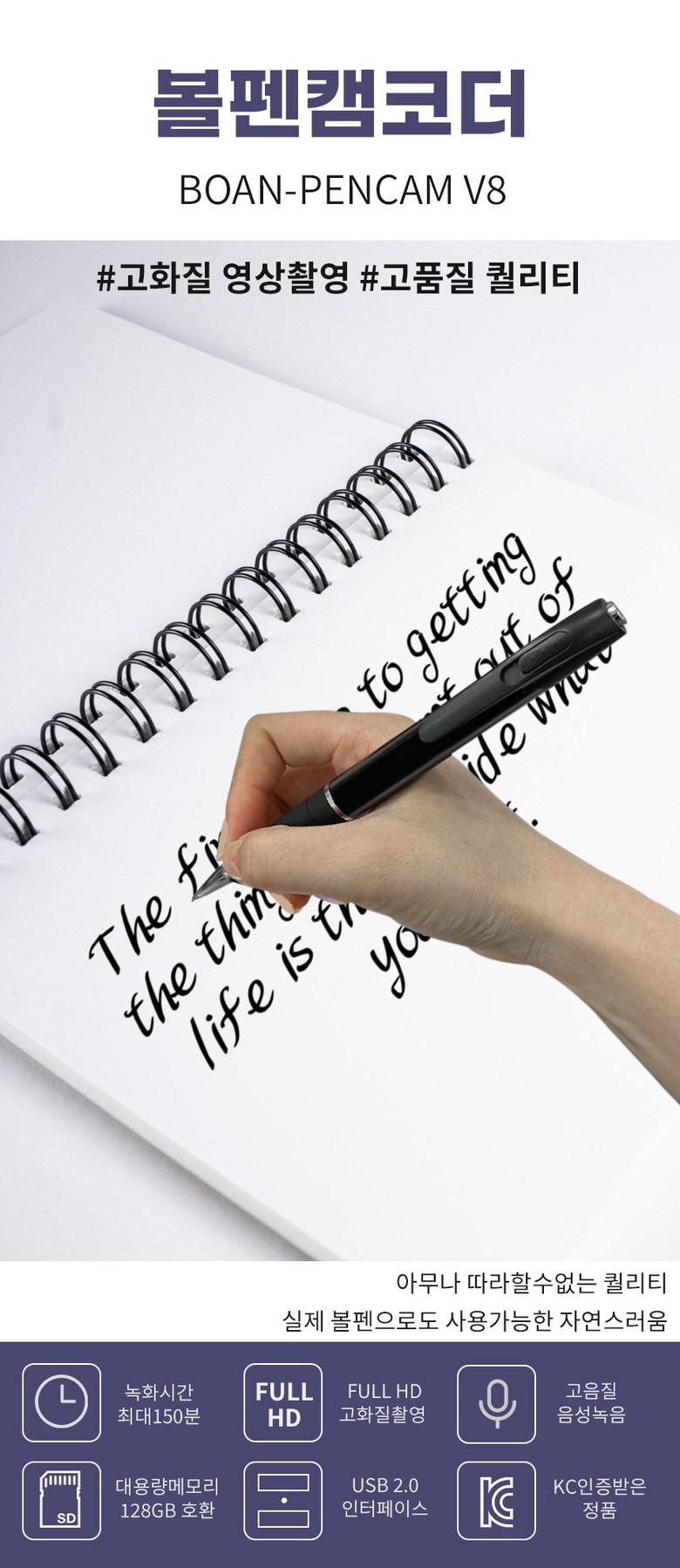 BOAN-V8 볼펜형캠코더 카메라 고화질펜카메라 128GB