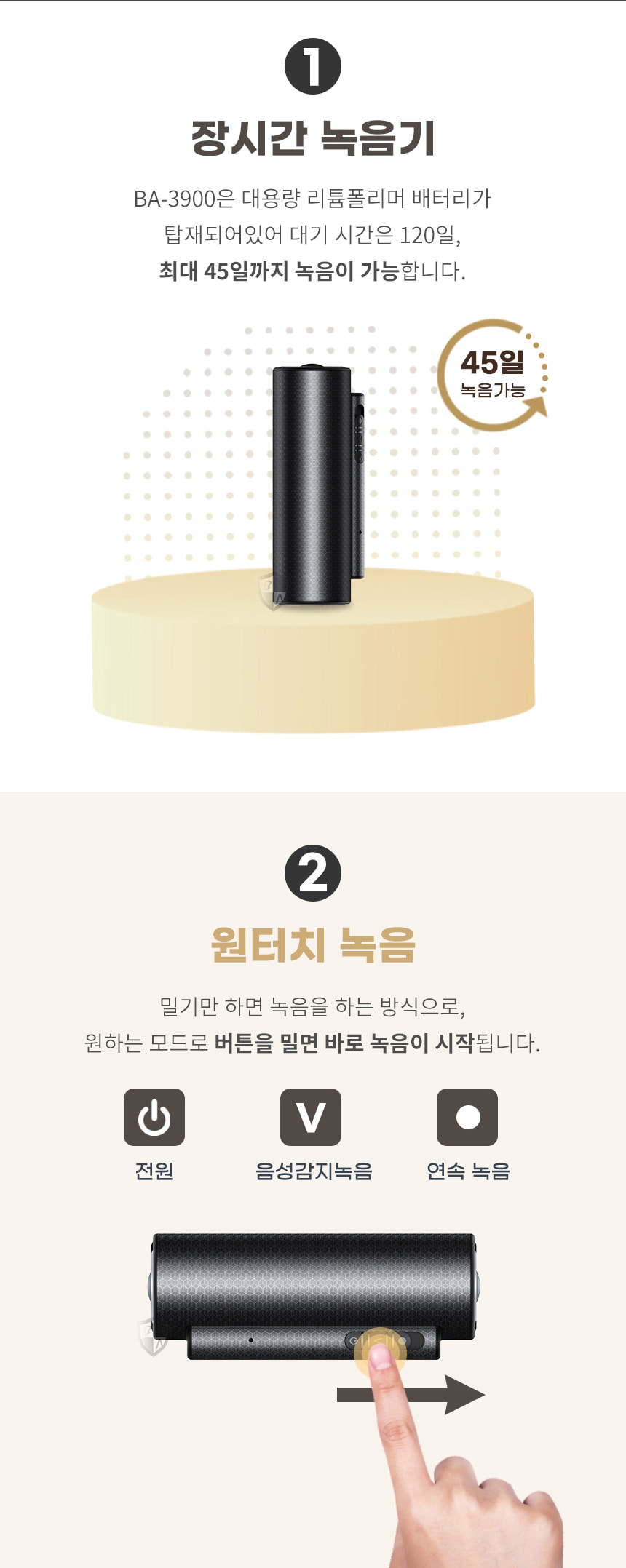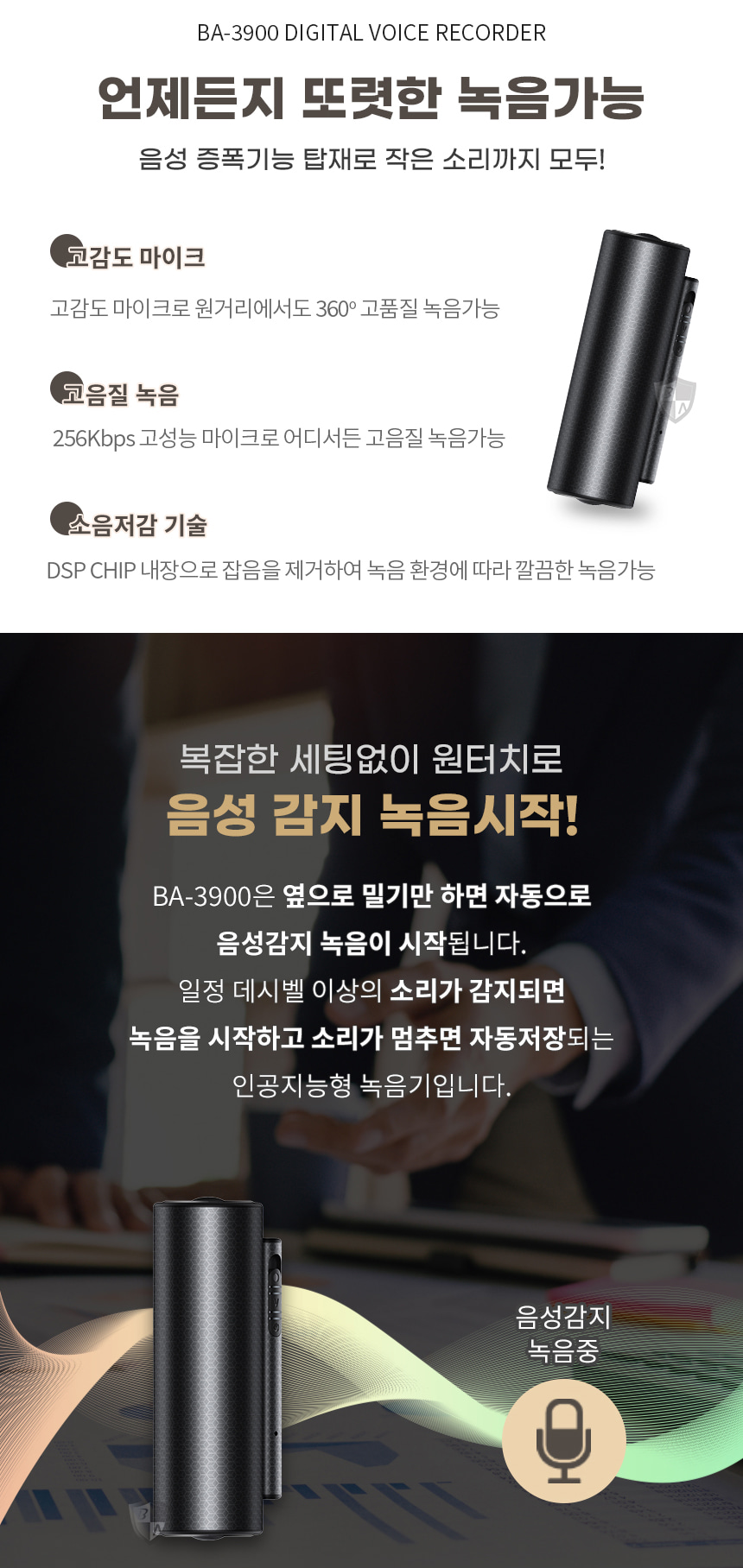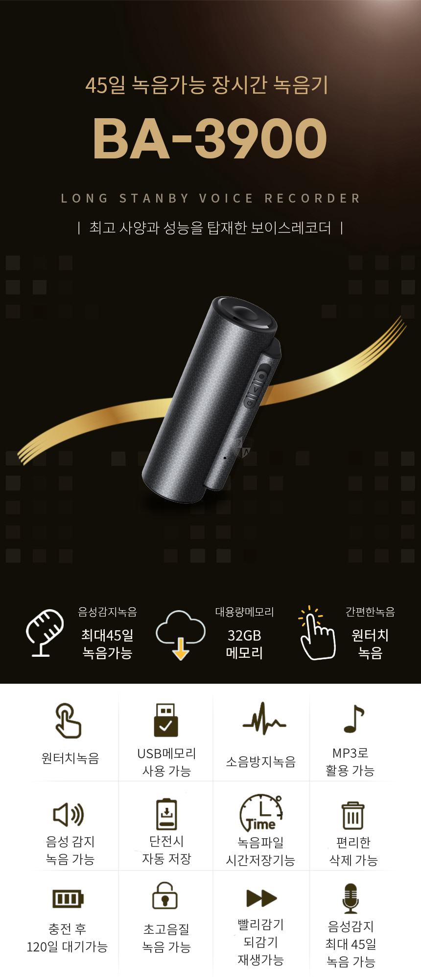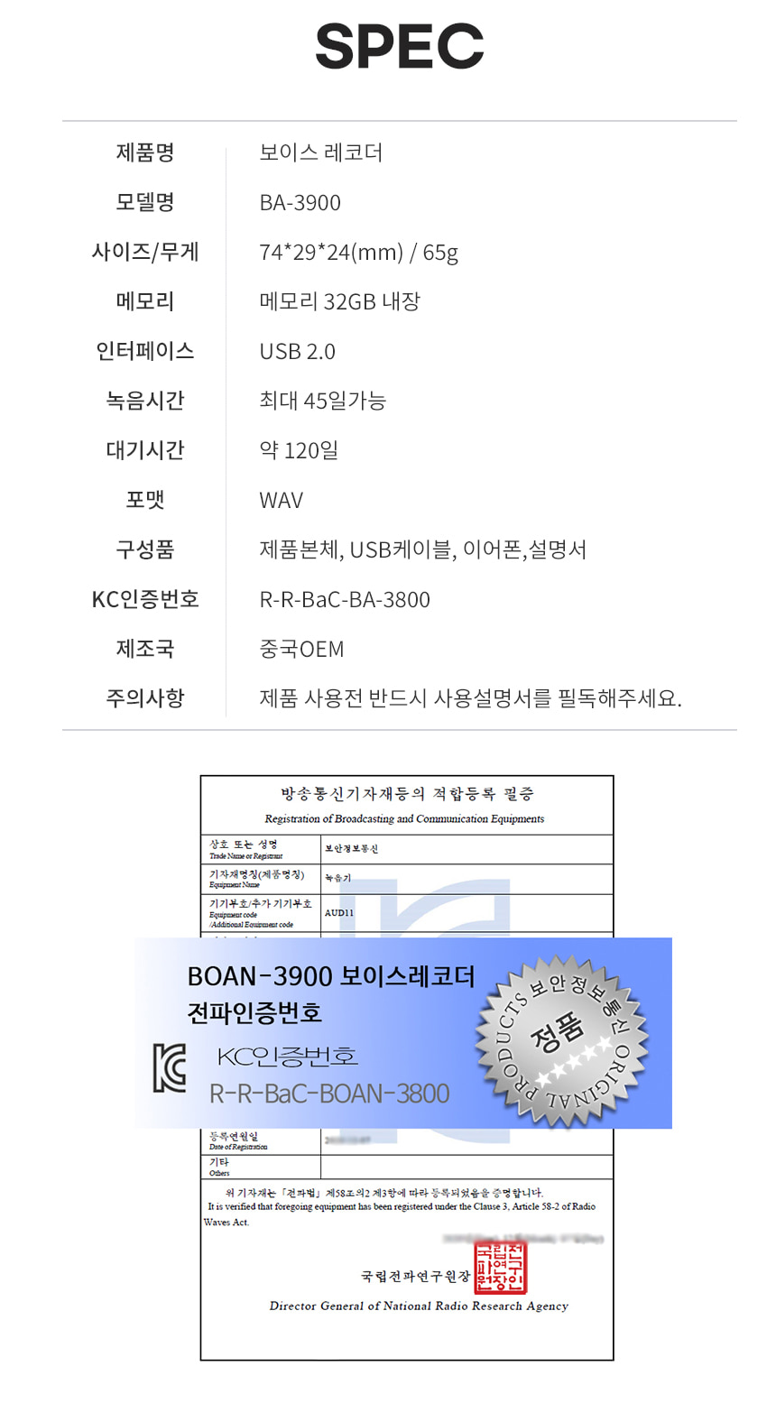 BA-3900 녹음기 장시간 45일 연속녹취 CA-B3900 차량장착 특수대화 녹취 증거물 32gb