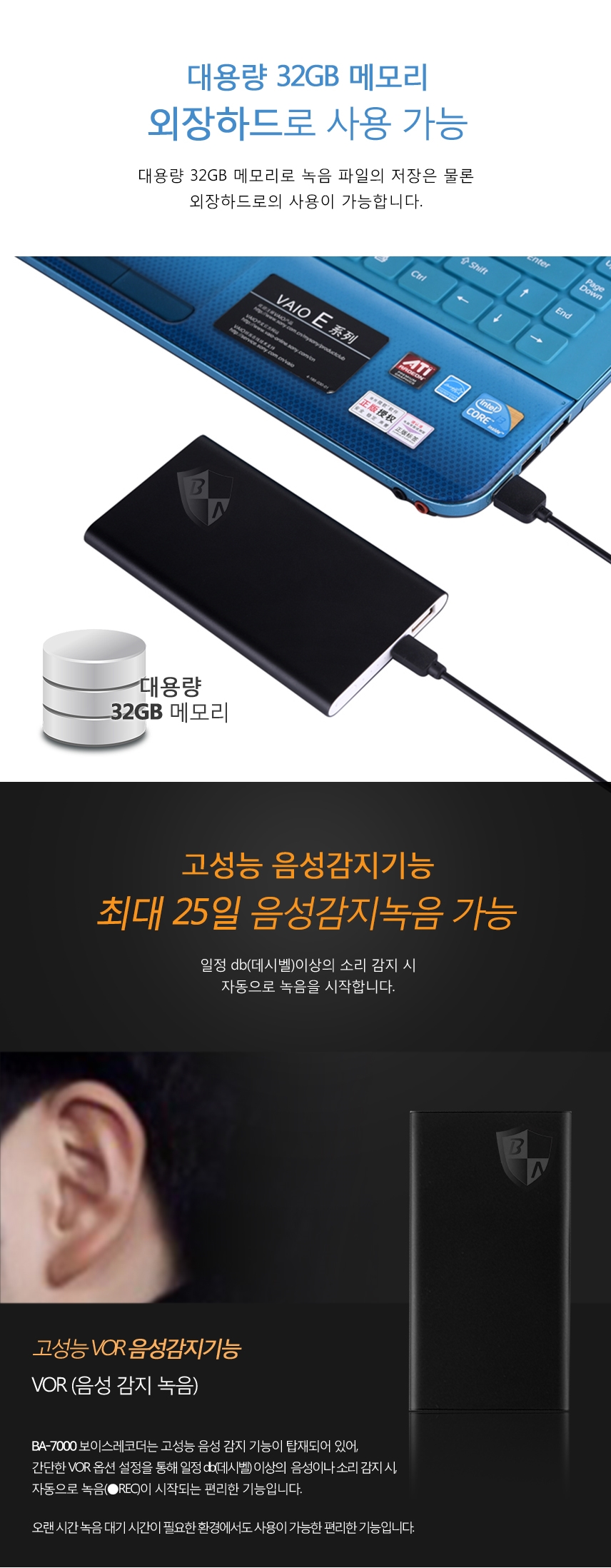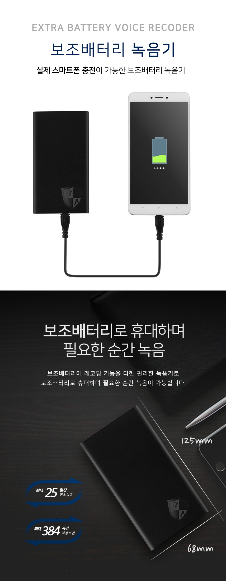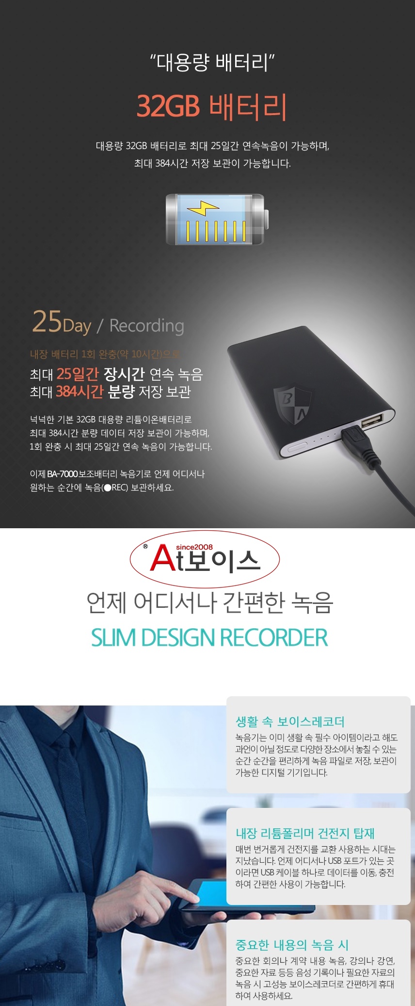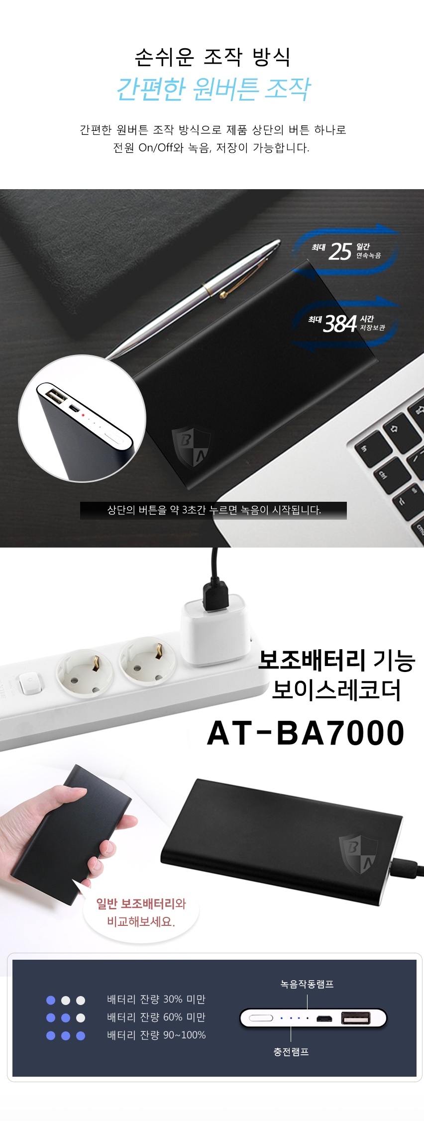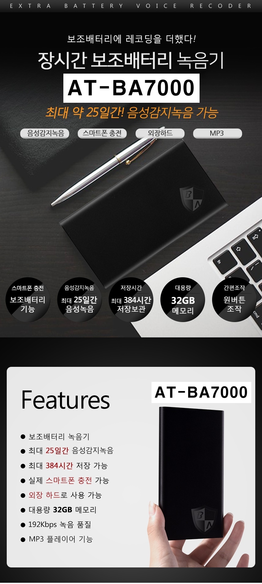 BA-7000 보조배터리장녹음기 장시간 25일 연속 녹음 32GB 대용량 한달연속사용