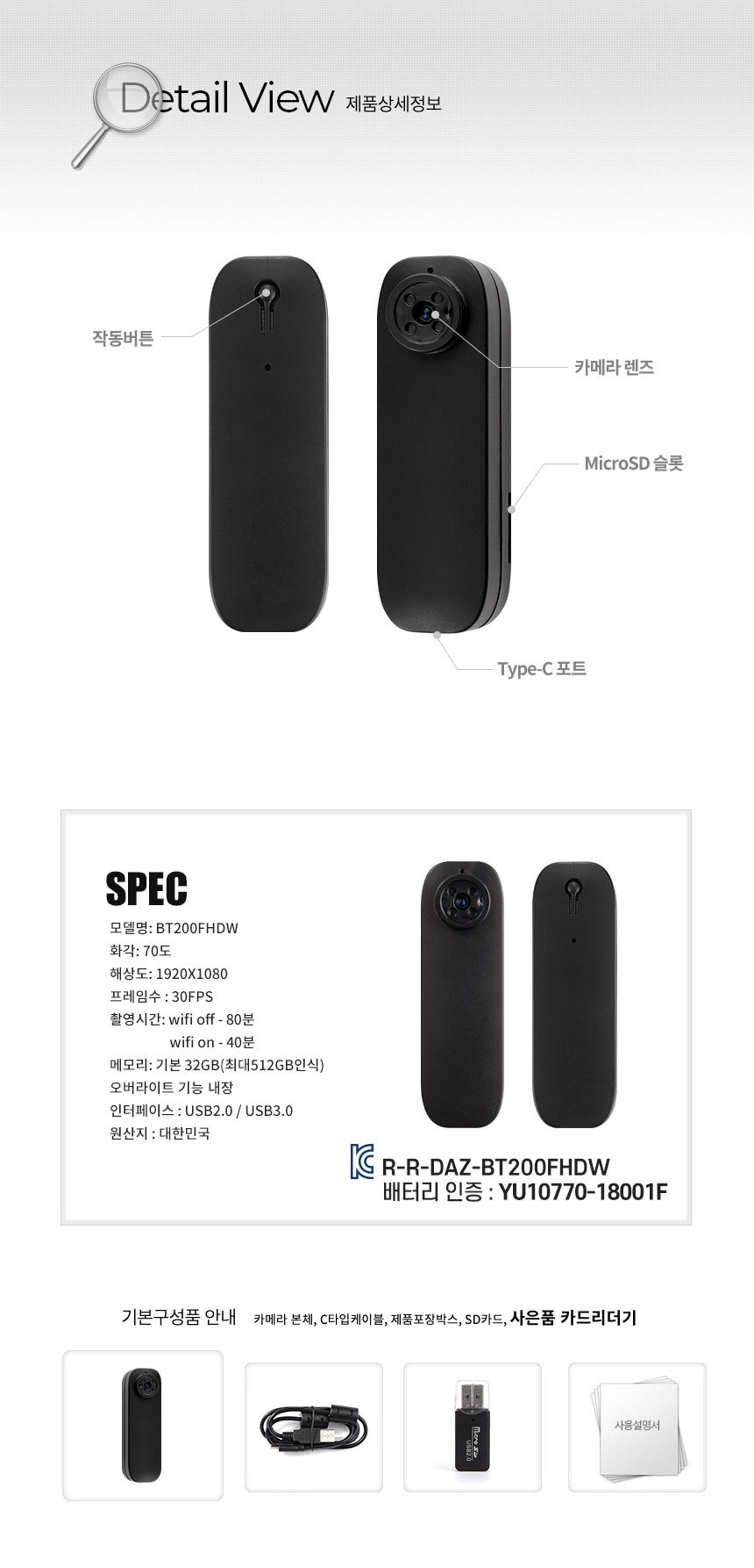 BT200FHDW 단추캠코더 디지털카메라 WIFI 저저도 70도 화각 줌기능 512GB 호환