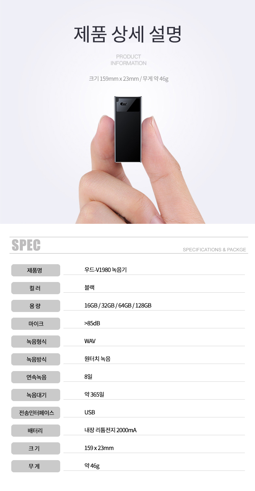 JB-V1980 장시간 녹음기 365일 전력대기 소리감지 VOS 짱짱녹음 차량용 대화 녹취 자석특수부착